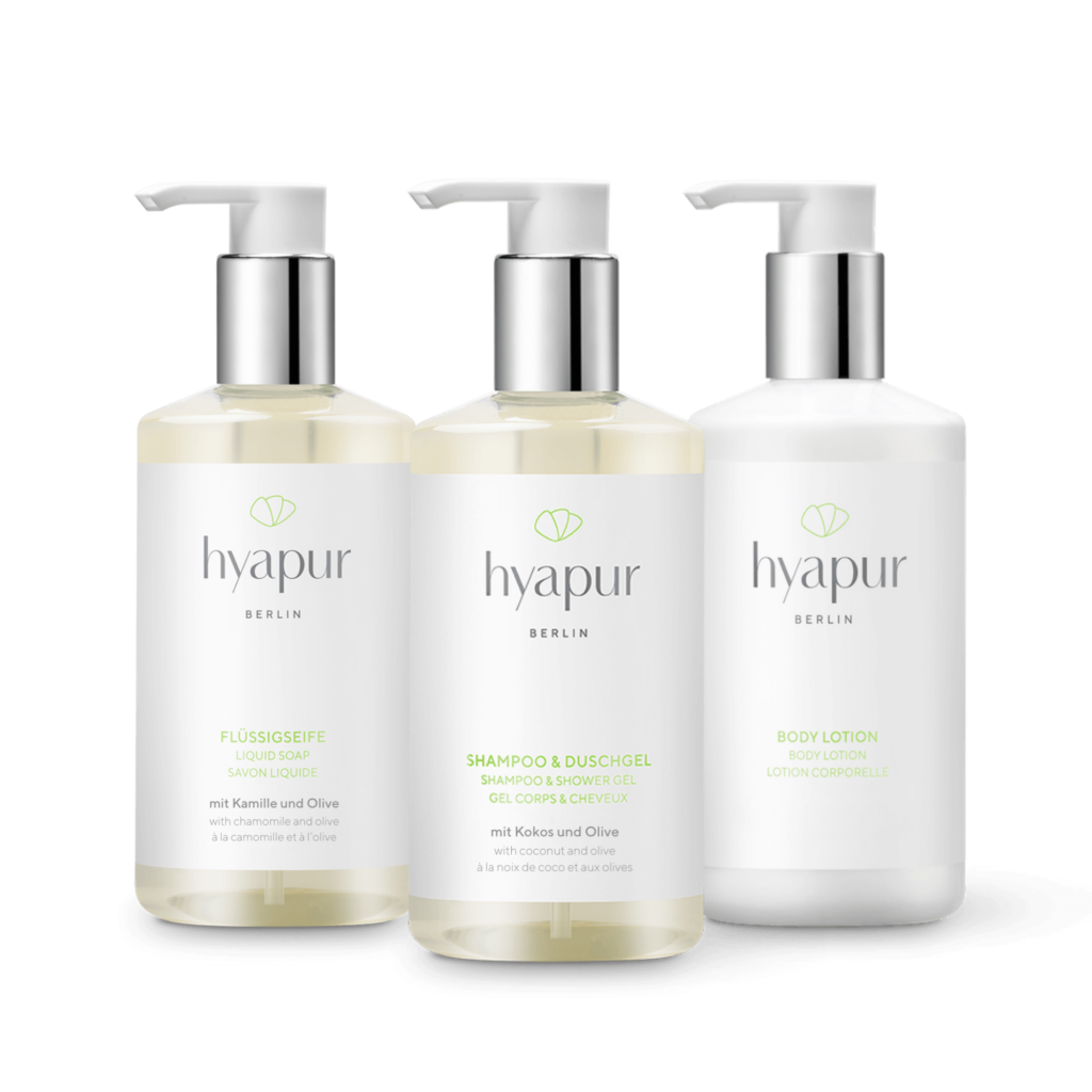 Das Set für Zuhause enthält die Flüssigseife, das Shampoo & Duschgel sowie die Body Lotion im 300ml Pumpspender.